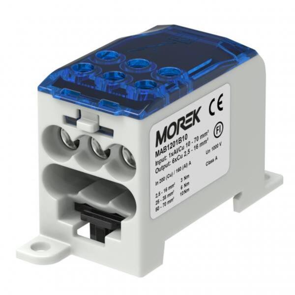 MOREK OJL 200A Elosztóblokk; be:1xAl/Cu10-70; ki: 6xCu 2,5-16mm2, kék (MAB1201B10)