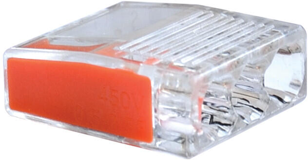 Tracon Csavar nélküli vezetékösszekötő, átlátszó/narancs 3×0, 5-2, 5mm2, 450VAC, max. 16A (RVO2-5-3)