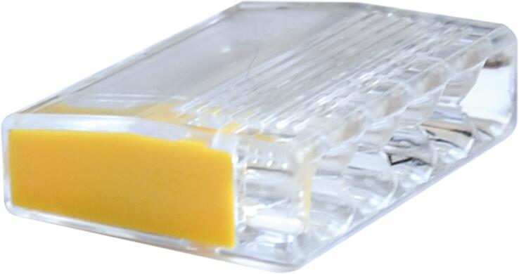 TRACON Csavar nélküli vezetékösszekötő, átlátszó/sárga, 5x0,5-2,5mm2, 450VAC, max. 16A (RVO2,5-5)