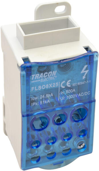 Tracon Fővezetéki leágazó sorkapocs nyitható fedéllel (betápsín) 8×25mm2 / 5×25(16), 4×16(10), 2×35(25)mm2 (FLSO8X25)