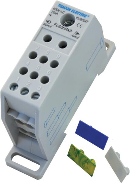 TRACON Fővezetéki leágazó sorkapocs, sínre szerelhető, 1x35mm2 / 9x4mm2, 400VAC, 125A, MULTICOLOR (FLS35/4X9)