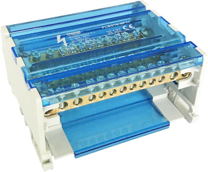 Tracon Moduláris elosztóblokk nyitható fedéllel, 3x16(10) mm2 / 8x10(6) mm2, 500VAC/DC, 80A (FLSO16-4P11) (FLSO16-4P11)