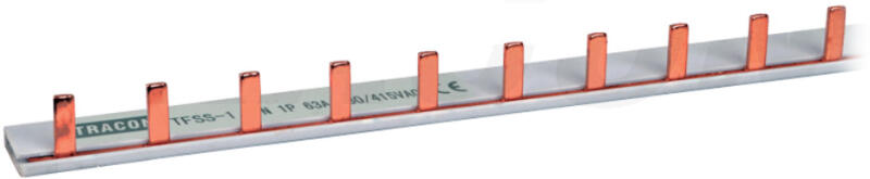 TERMÉK LEÍRÁS: Sorolósín - csapos kivitelű (TFSS-1) A TFSS- kódjelű sorolósínek kismegszakítók betáplálási oldalainak közösítésére, összekötésére szolgálnak. A csapos kivitelek hüvelykapcsokhoz, a villás kivitelek csavarfejjel szorító csavaros csatlakozókapcsokhoz használhatók. A sorolósínek a szükséges méretre darabolhatók. A pólusok egymáshoz képest kis mértékben elmozdíthatók. max. 63A, 230/400VAC, 1P, 56modul, 1m